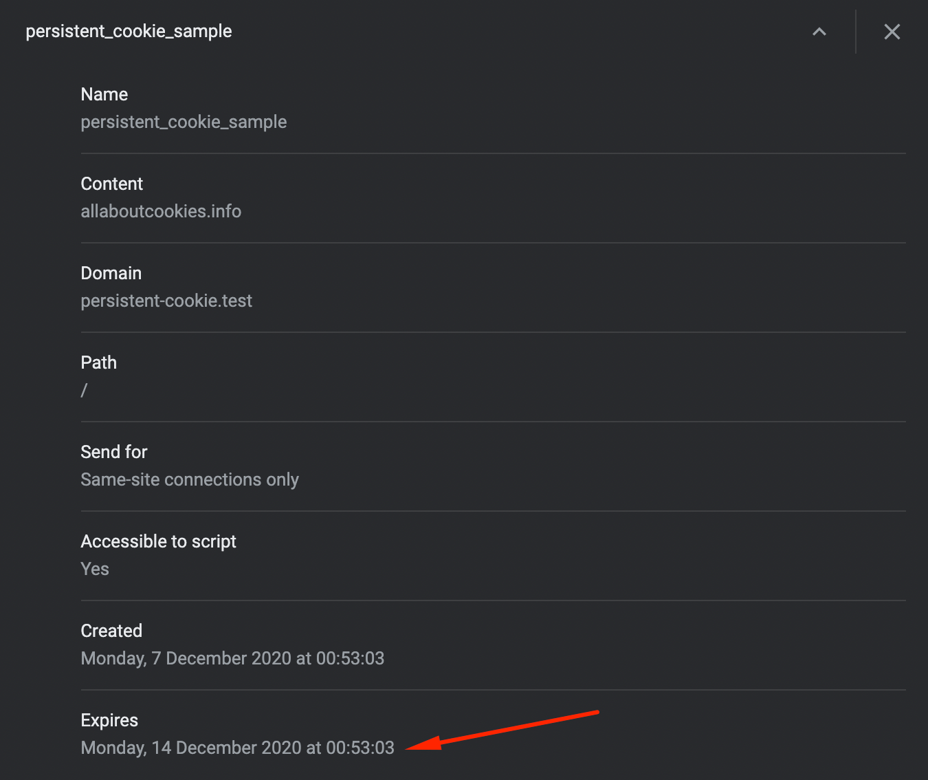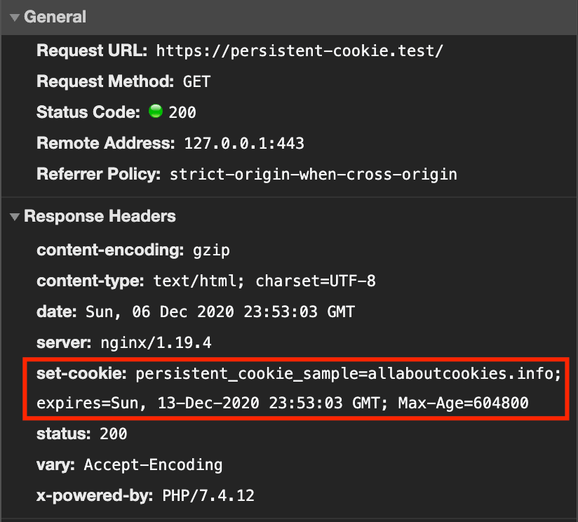 When a browser sends a request to a website to load a page, the response from the server contains the set-cookie response header containing a key-value pair (in our example on the screenshot below the key is persistent_cookie_sample and the value is allaboutcookies.info), but it also contains an expiry date and time. So, in an example below the cookie was created on Dec 6th 2020 at 23:53 and was set to expire in 7 days on Dec 13th at 23:53.